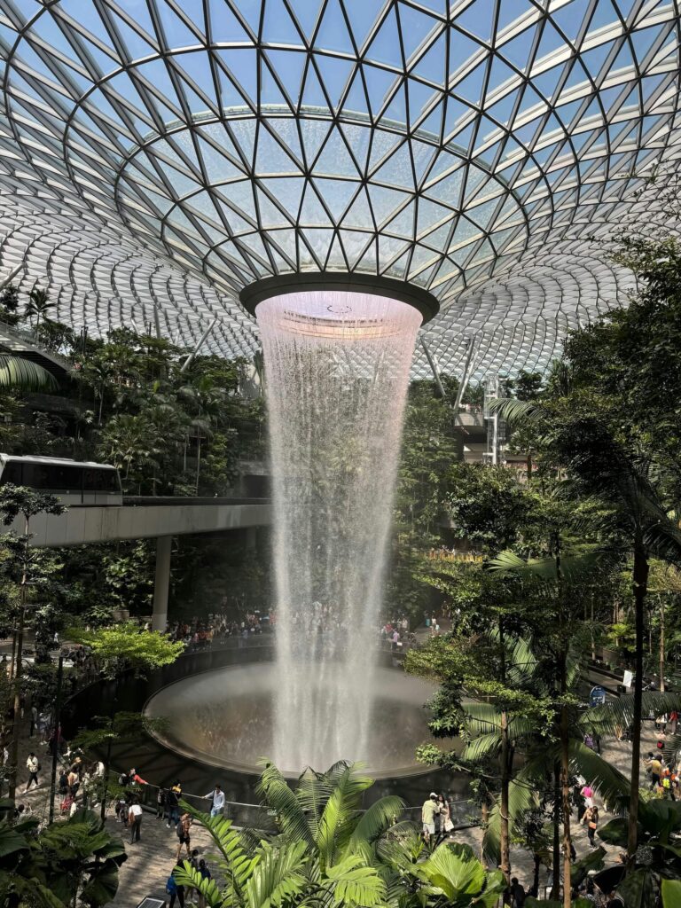W centrum Jewel Changi wznosi się Rain Vortex – najwyższy kryty wodospad świata, otoczony bujną dżunglą i kładkami zawieszonymi wśród koron drzew.